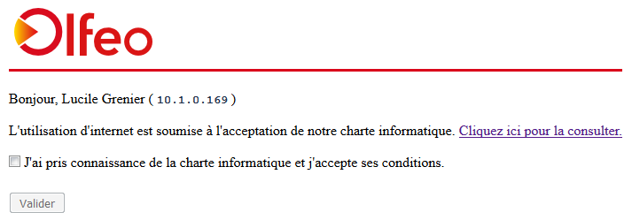 aux utilisateurs. Lorsqu'une charte internet est activée, l'utilisateur qui tente de se connecter à internet reçoit une page lui donnant accès au texte de la charte et lui permettant de la signer. L'utilisateur ne peut pas surfer tant qu'il n'a pas signé la charte. Une fois la charte signée, la page n'apparaît plus.